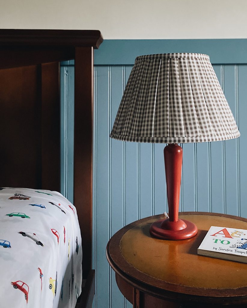 I came across Benjamin Moore’s Caliente and knew it was the one! It’s the perfect, captivating and classic red. I covered Matteo’s tall bookshelf and hand-me-down lamp base from his older cousins with three coats of Caliente. It’s stunning and the perfect complement to Whipple Blue.